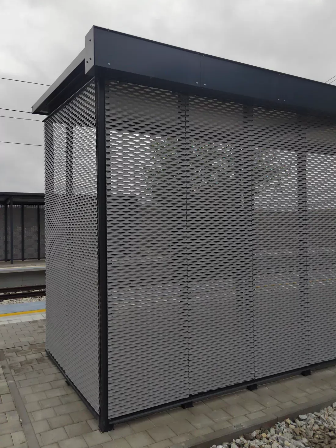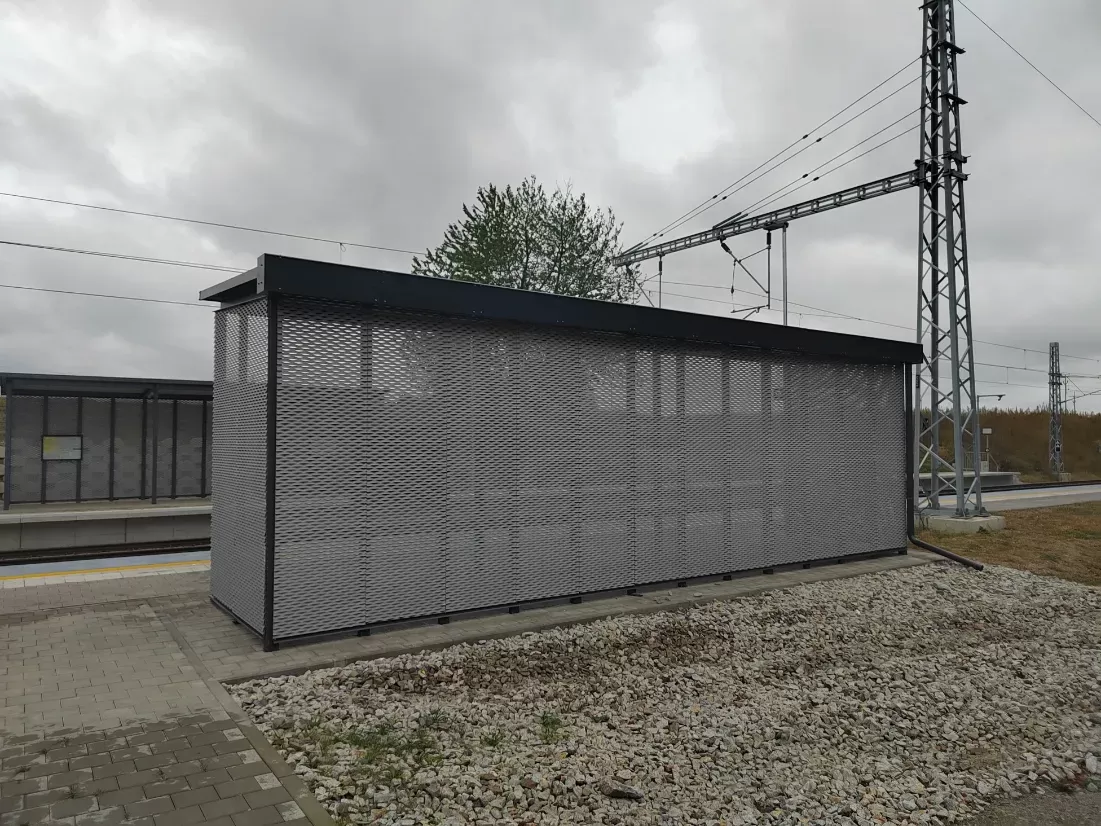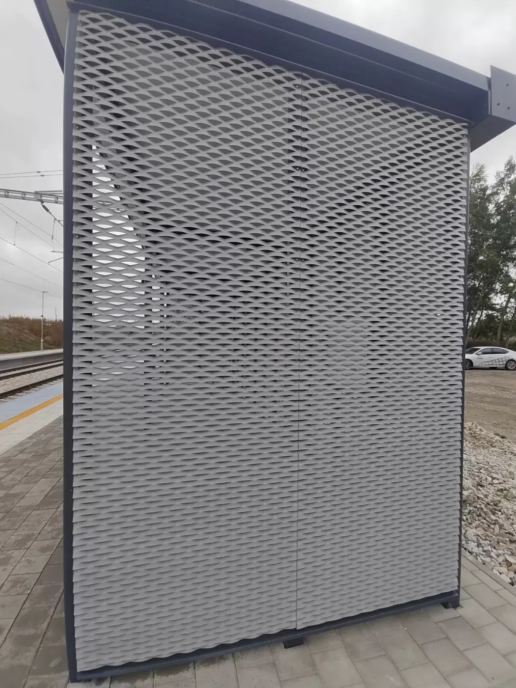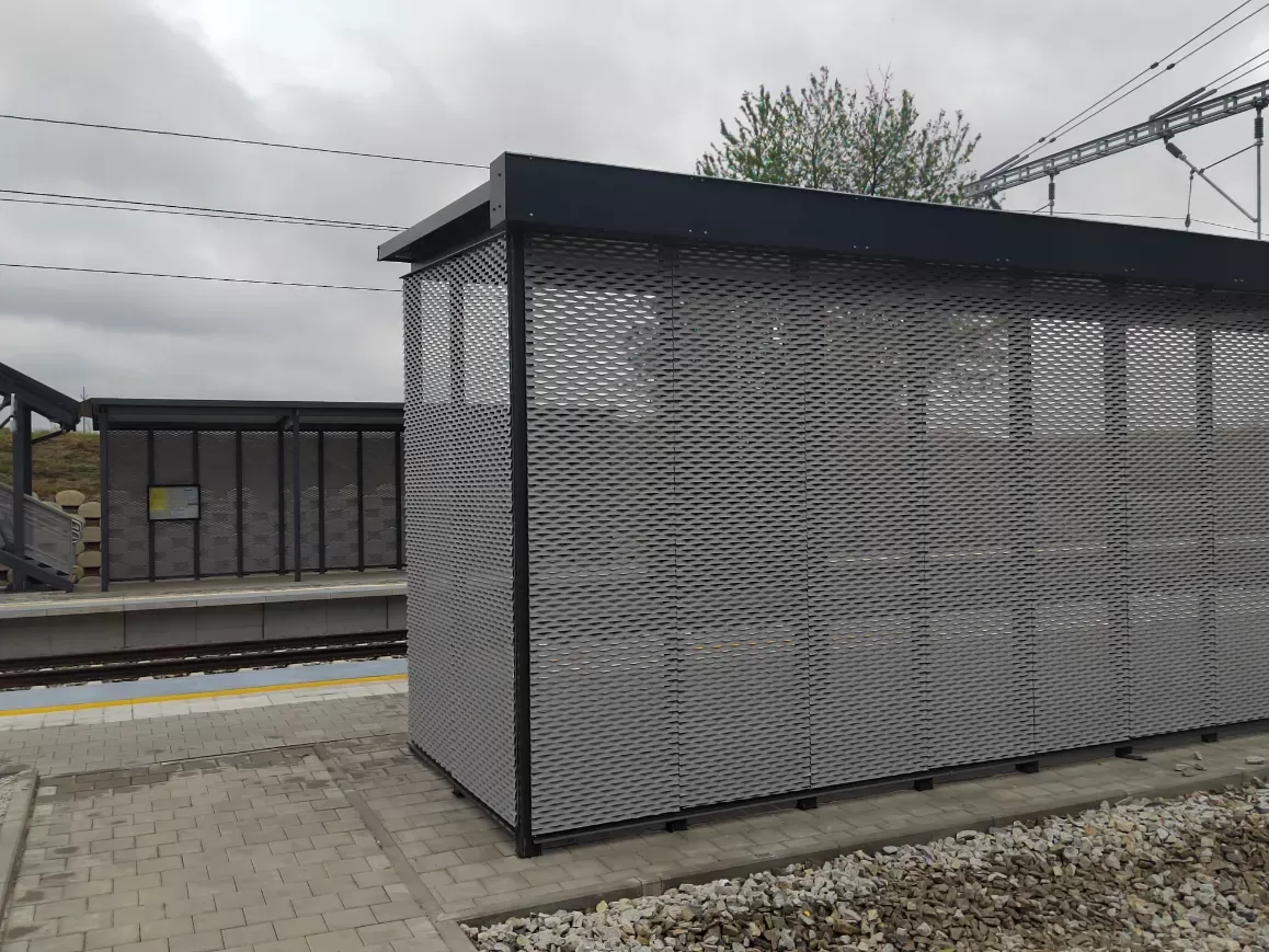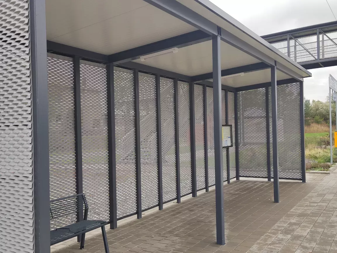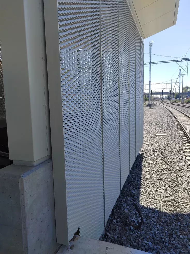 Anwendung: Verkleidung des Bahnhofs mit Streckmetall | Typ: Streckmetall 115 × 45 mm / Steg 20 mm | Material: Aluminium 1,5mm | Oberflächenbehandlung: Pulverbeschichtung RAL 7032 und RAL 9002