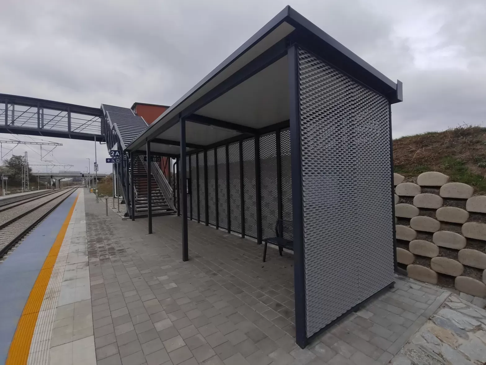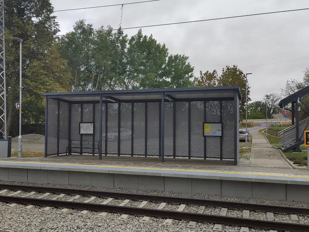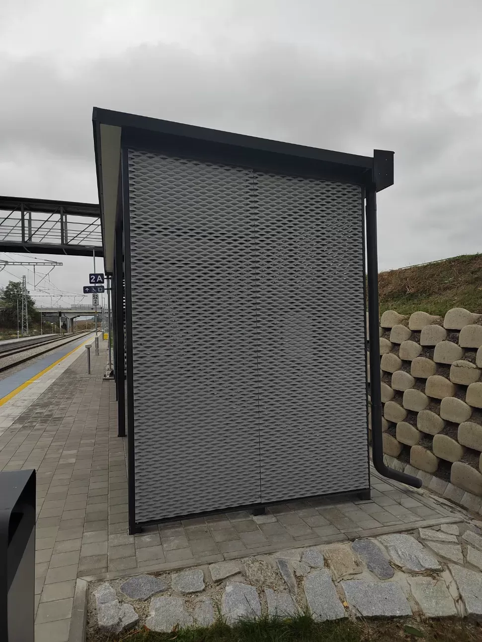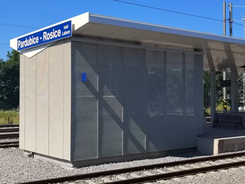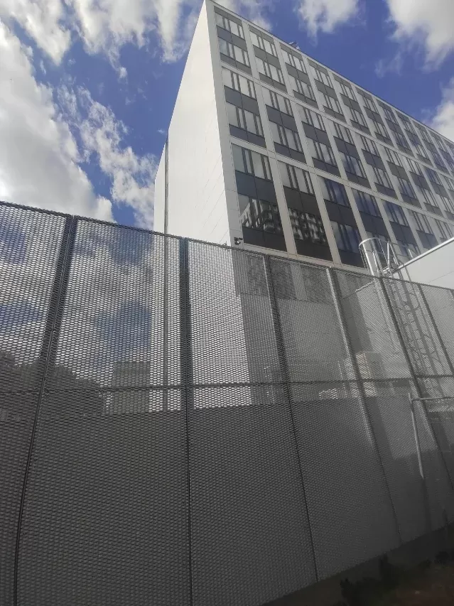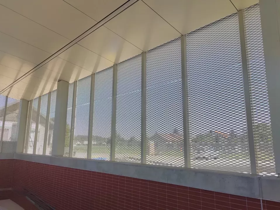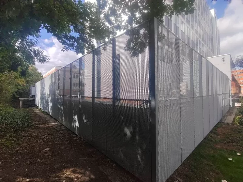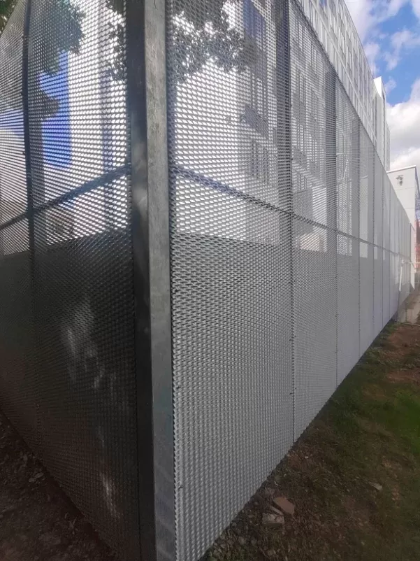 Anwendung: Verkleidung des Bahnhofs mit Streckmetall | Typ: Streckmetall 115 × 45 mm / Steg 20 mm | Material: Aluminium 1,5mm | Oberflächenbehandlung: Pulverbeschichtung RAL 7032 und RAL 9002