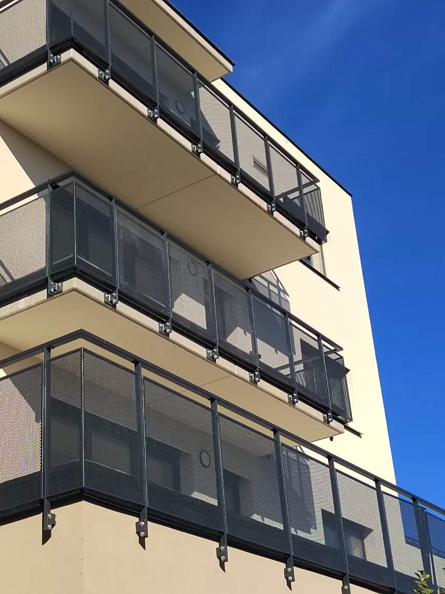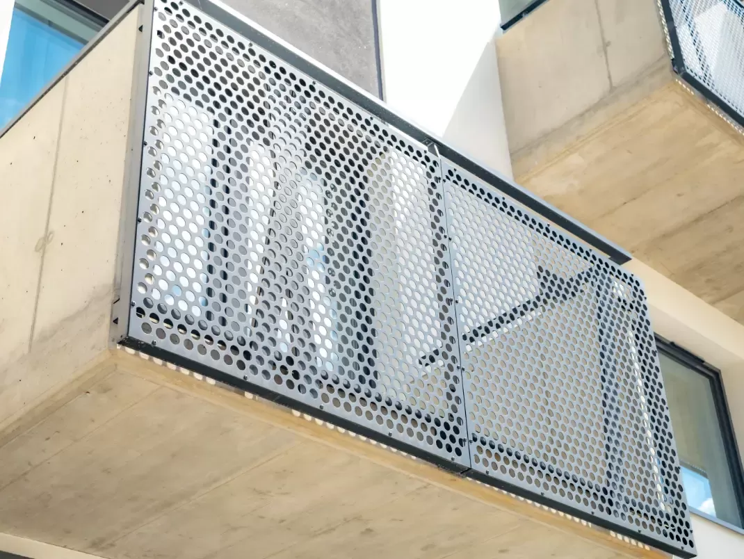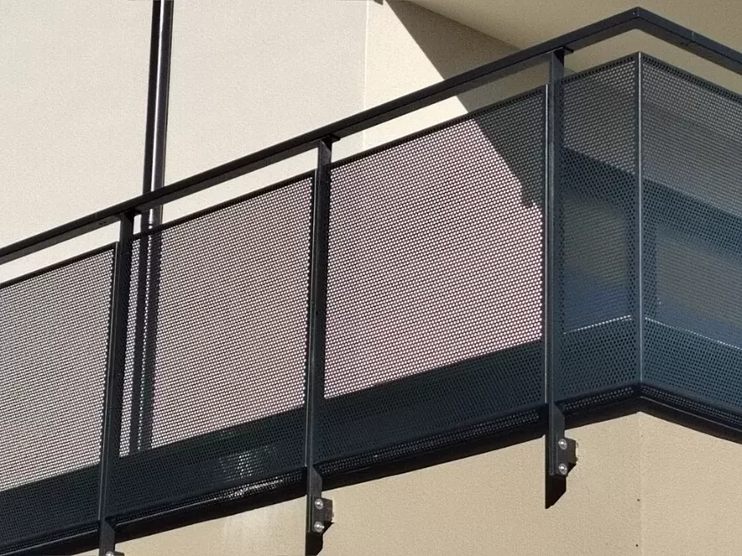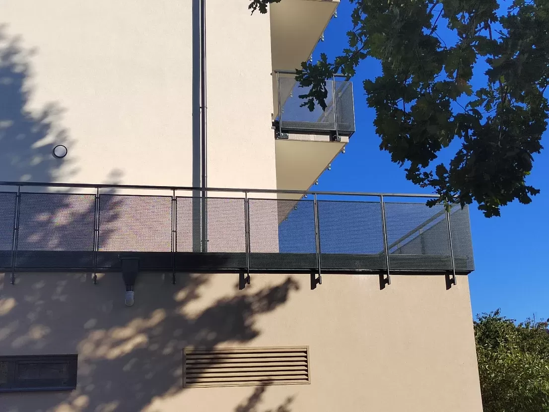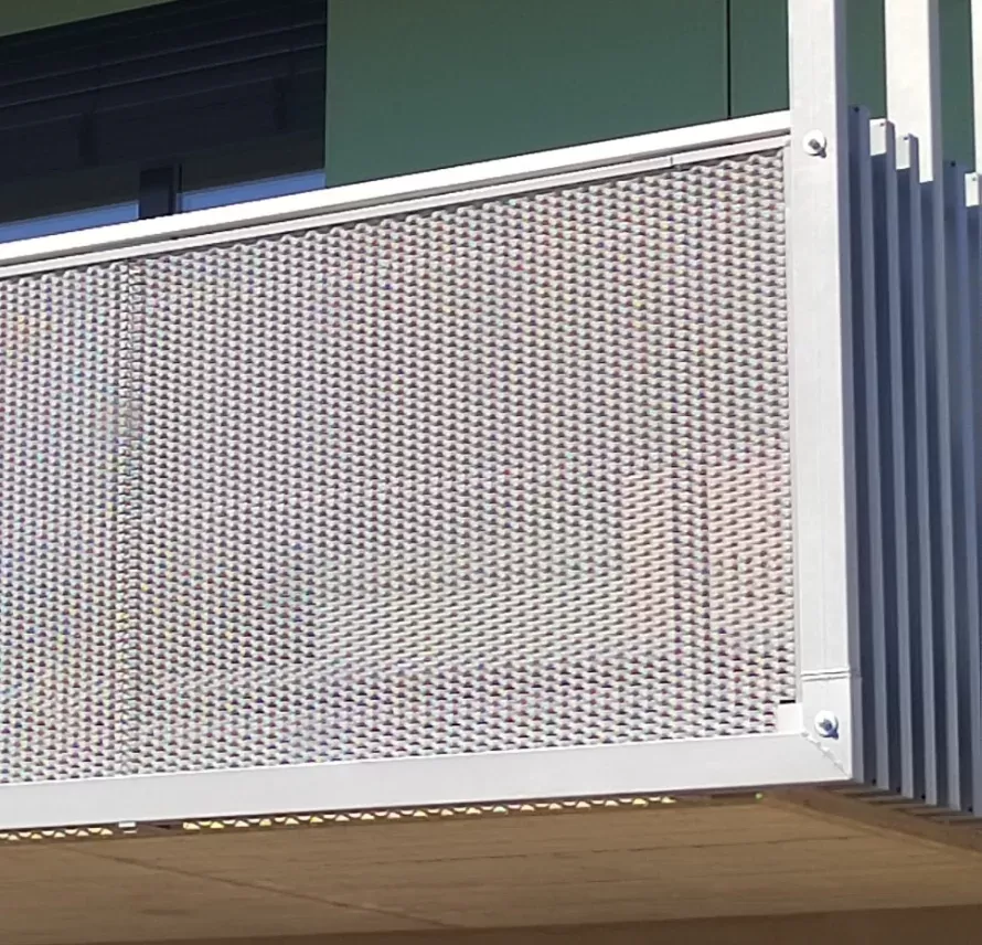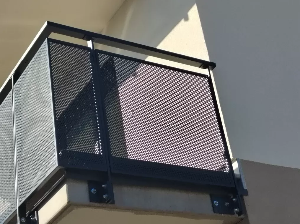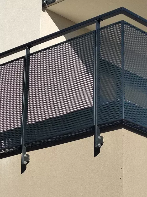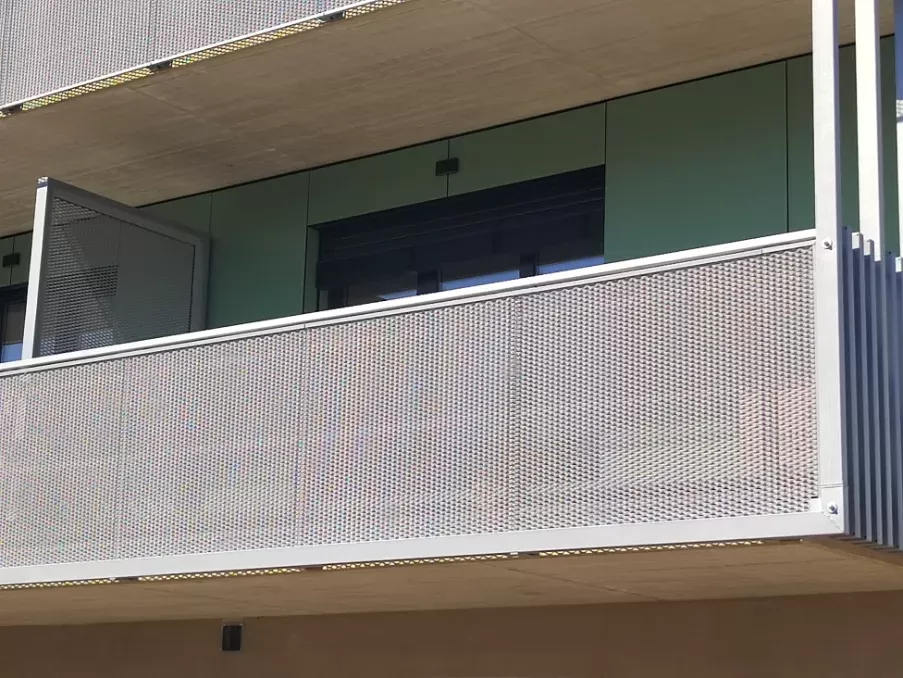 Anwendung: Balkonfüllungen eines Wohnhauses | Typ: Lochblech Rv 30-42 | Material: Verzinktes Blech 1,5 mm