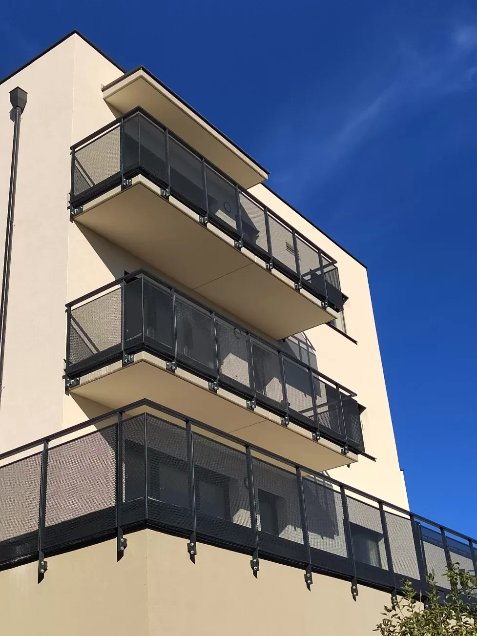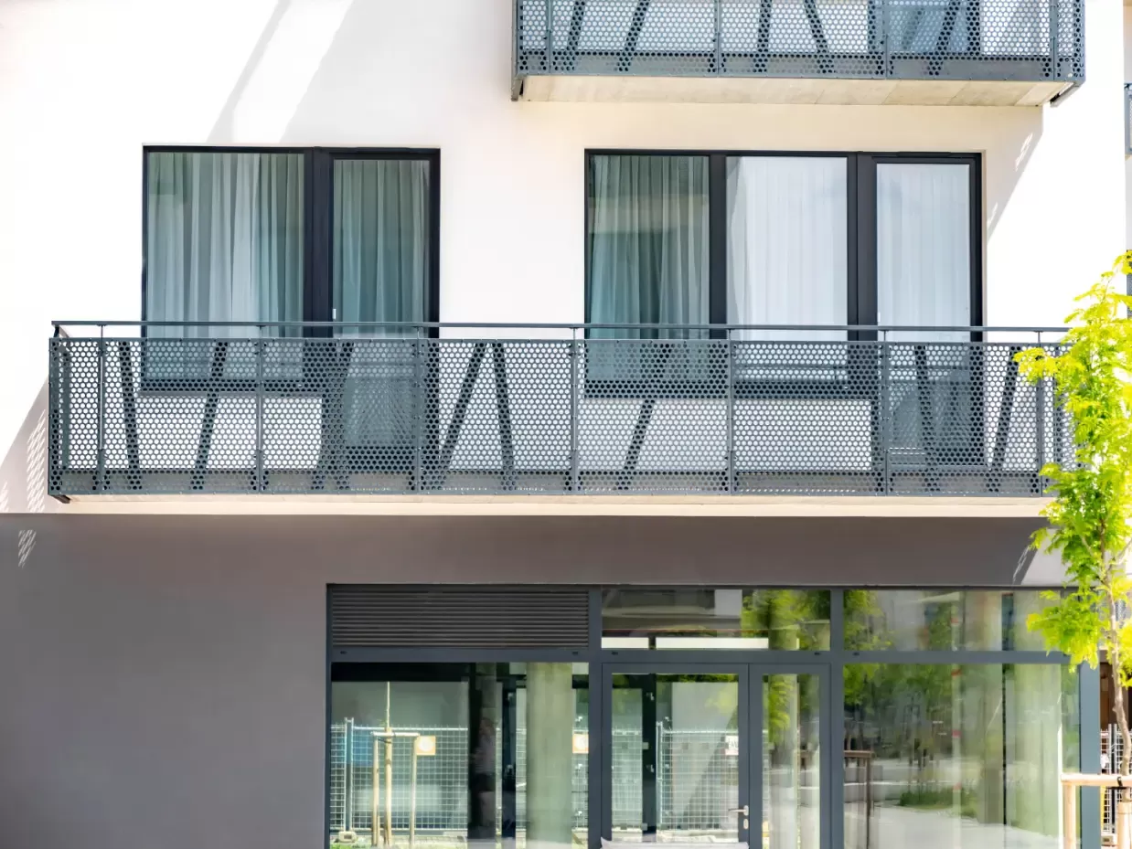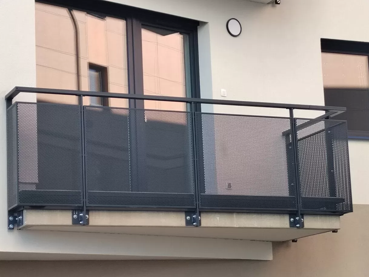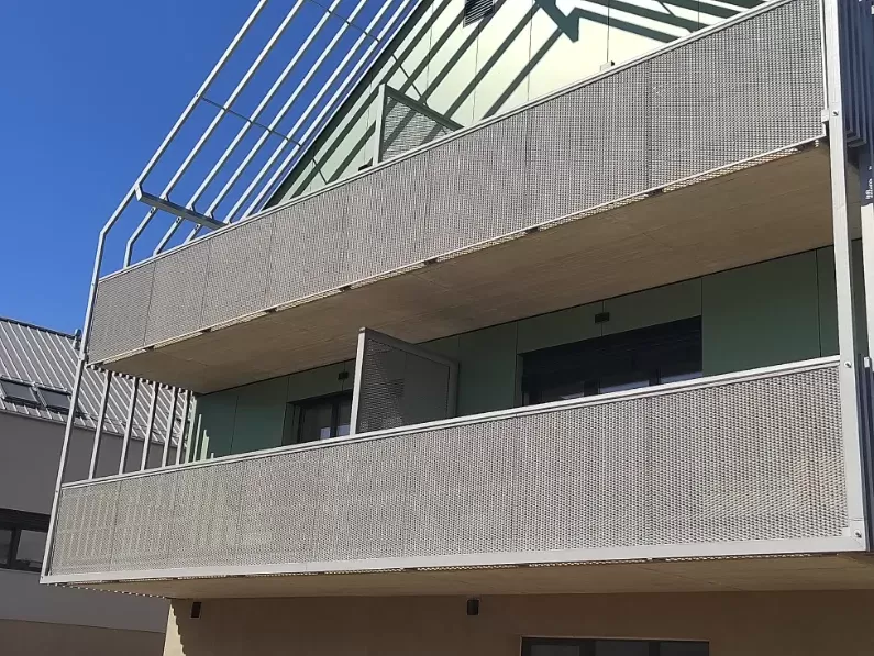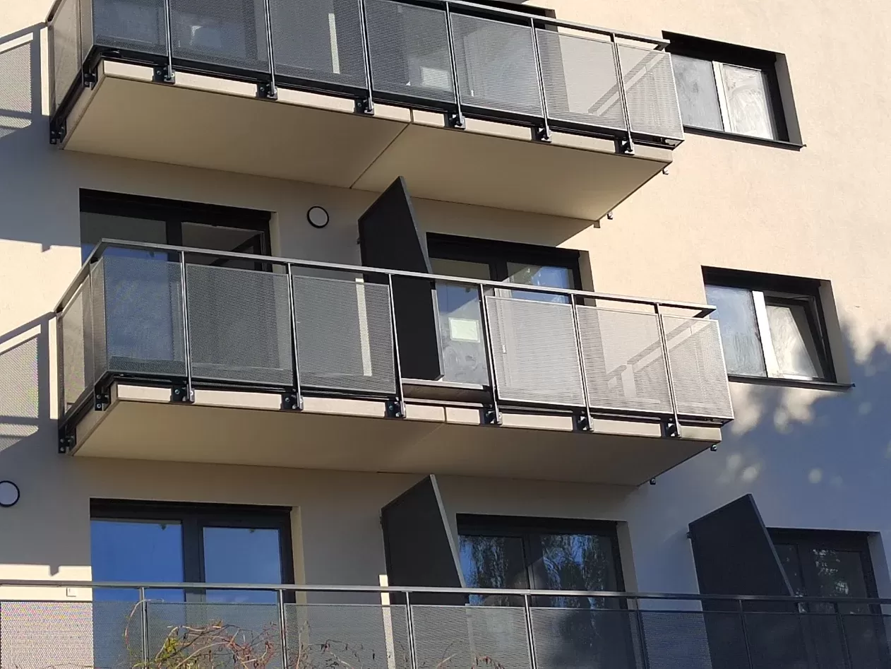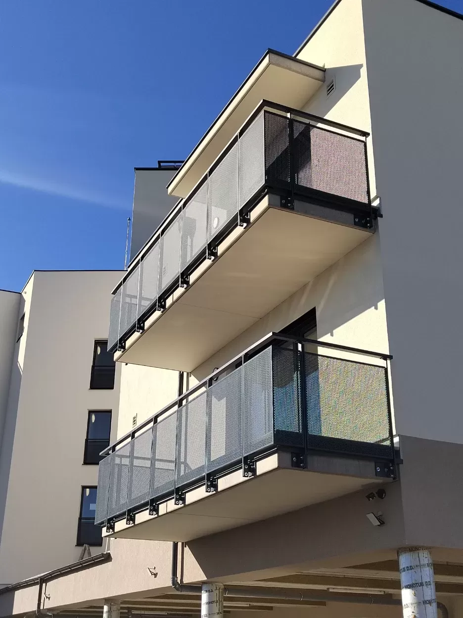 Anwendung: Balkonfüllungen eines Wohnhauses | Typ: Lochblech Rv 30-42 | Material: Verzinktes Blech 1,5 mm