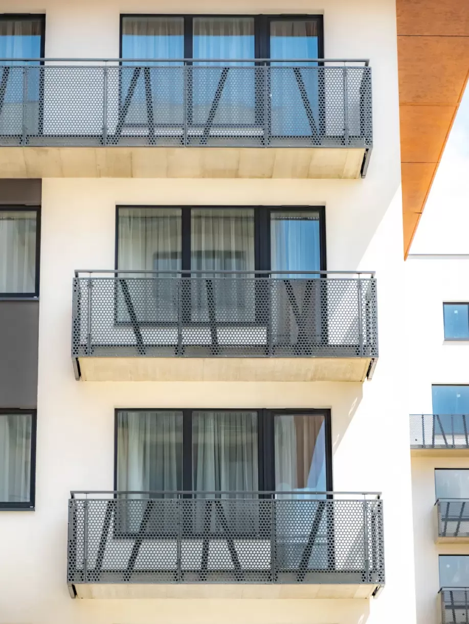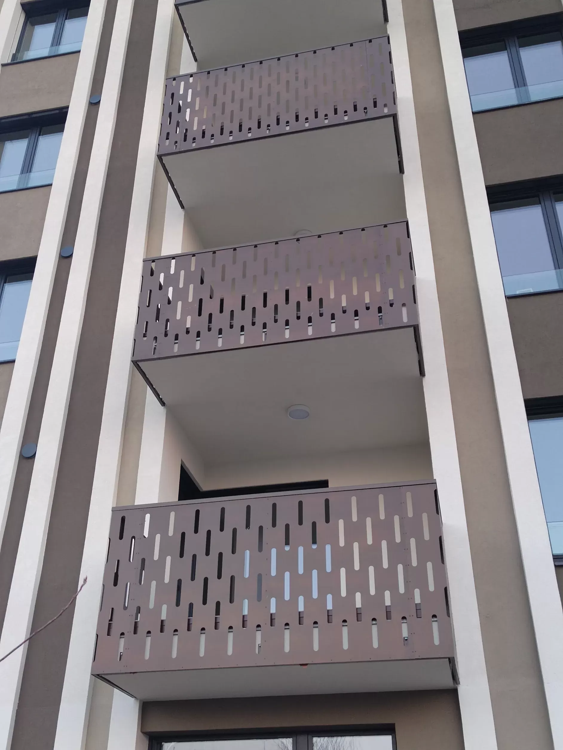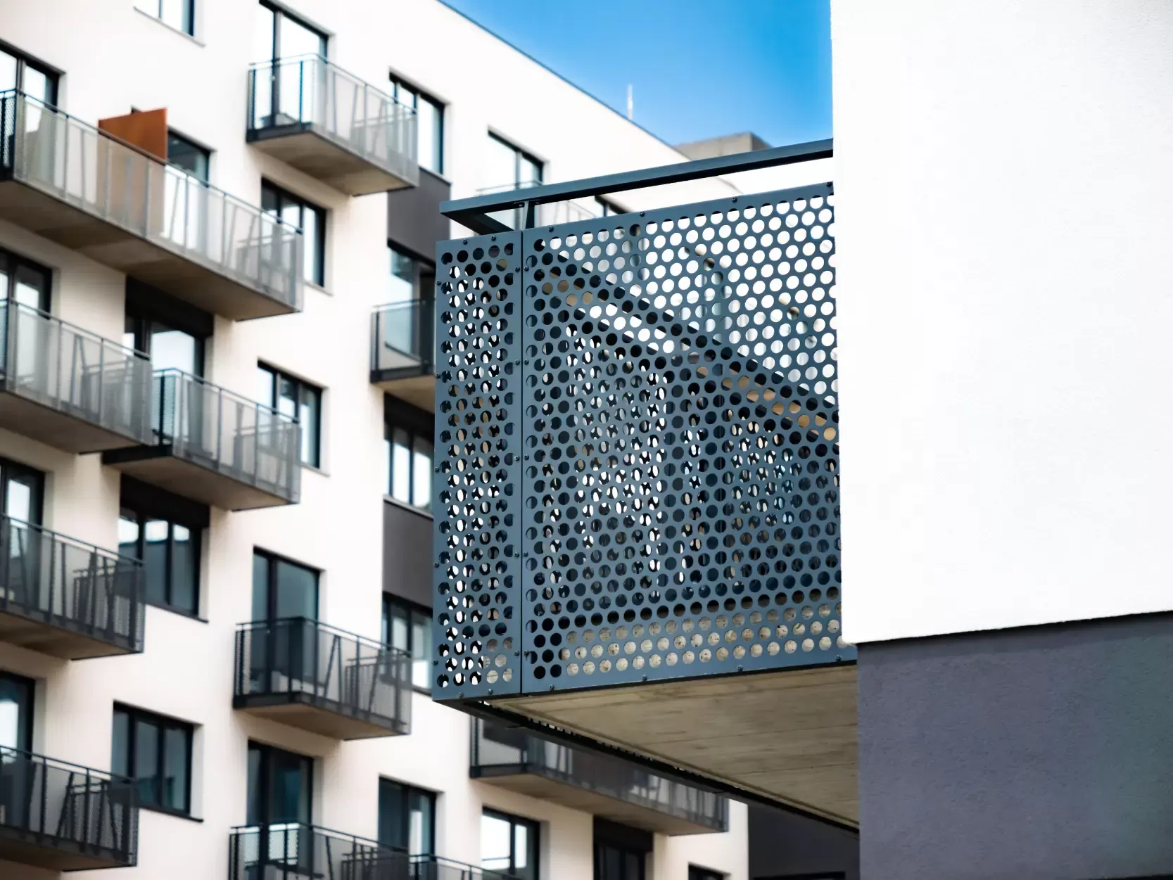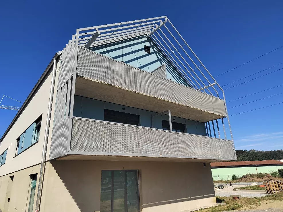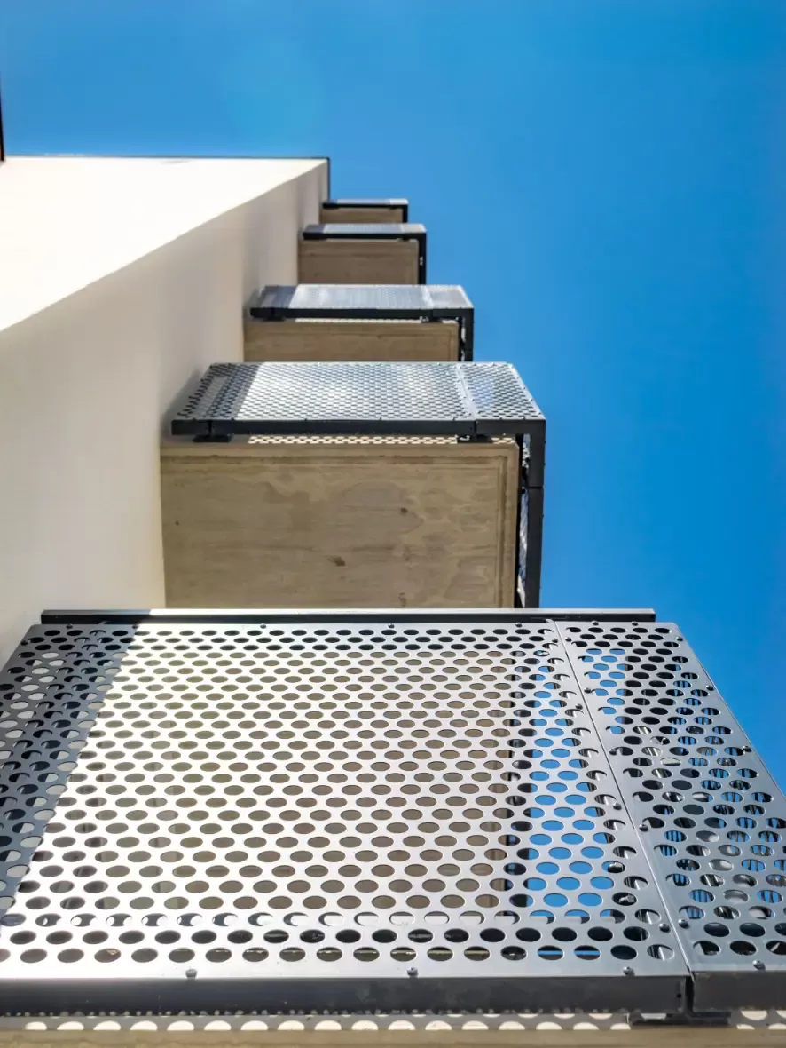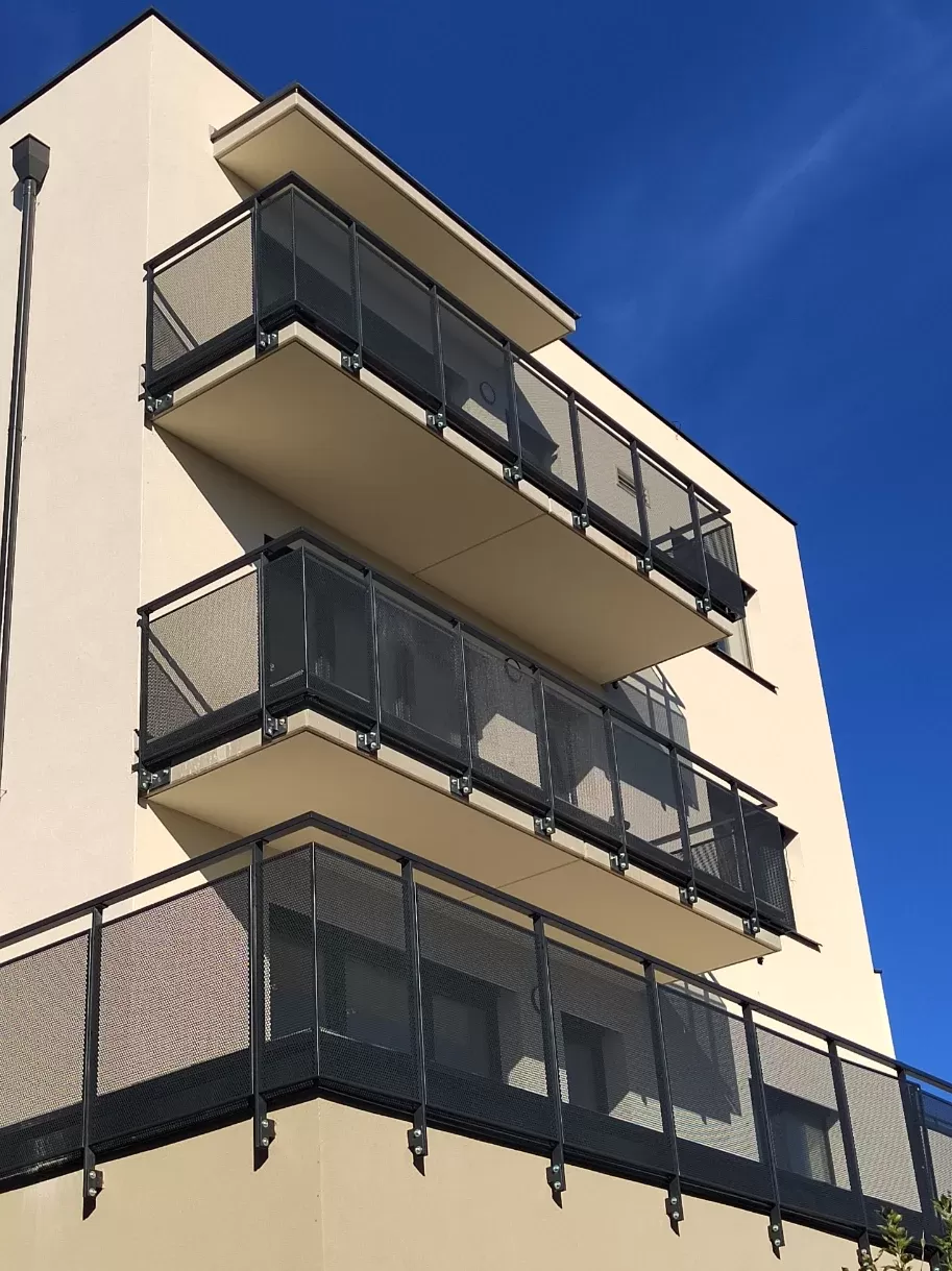 Anwendung: Balkonfüllungen eines Wohnhauses | Typ: Lochblech Rv 30-42 | Material: Verzinktes Blech 1,5 mm