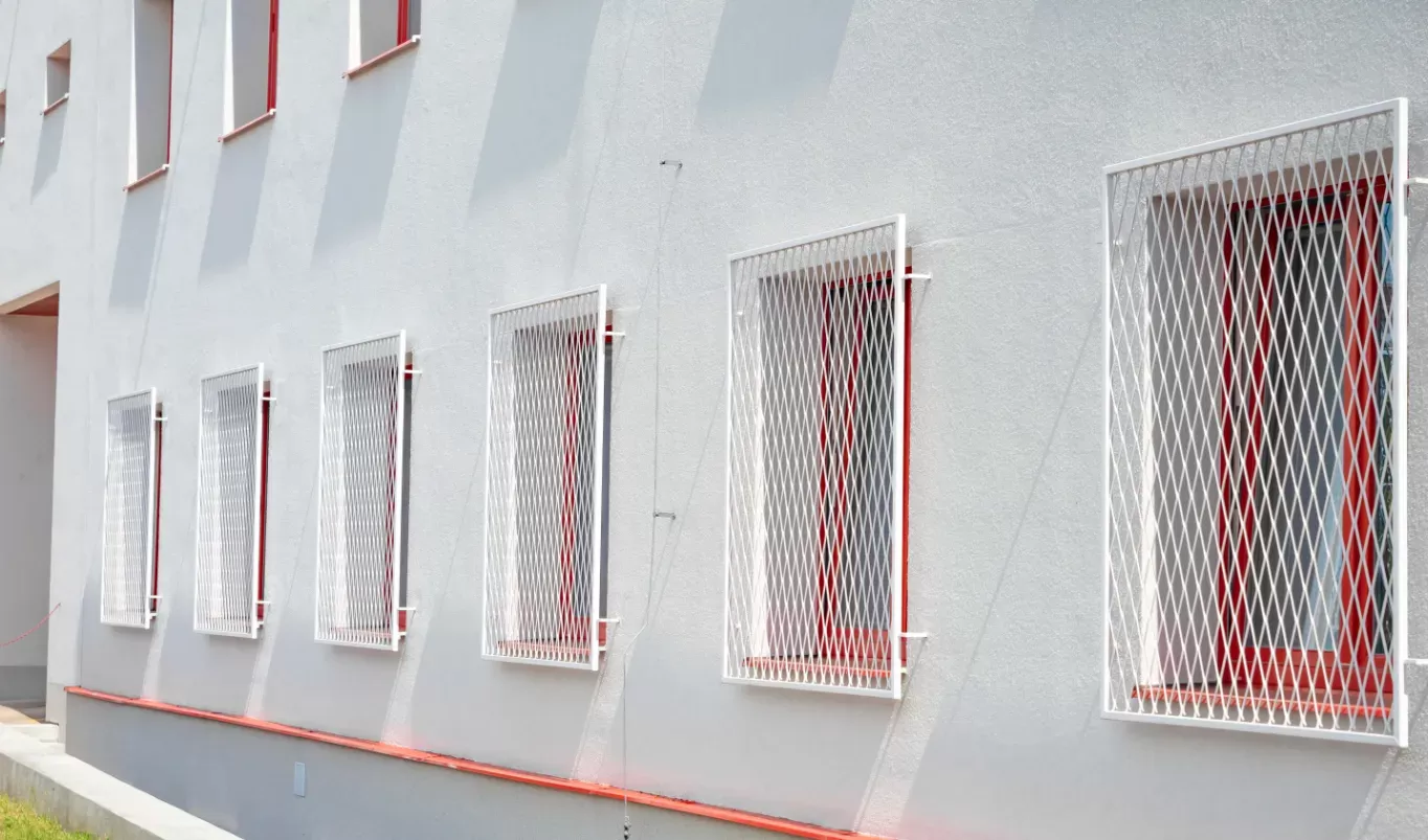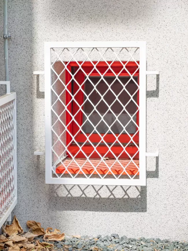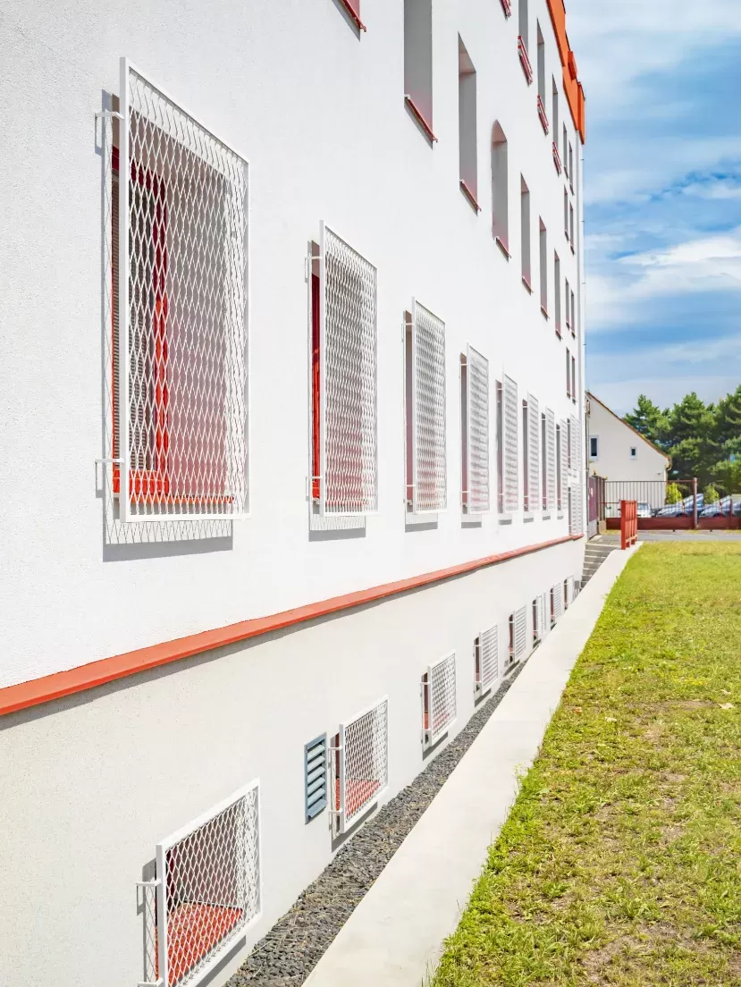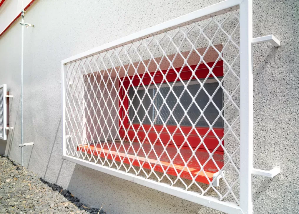 Anwendung: Schutzgitter für Feuerwache | Typ: Streckmetall 200 × 80 mm / Steg 6 mm + Streckmetall 100 × 65 mm / Steg 6 mm | Material: Stahl 4,0mm | Oberflächenbehandlung: Feuerverzinkung und Pulverbeschichtung