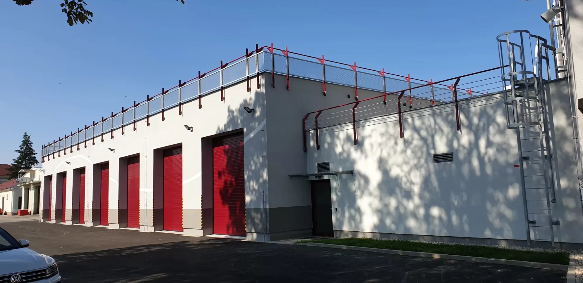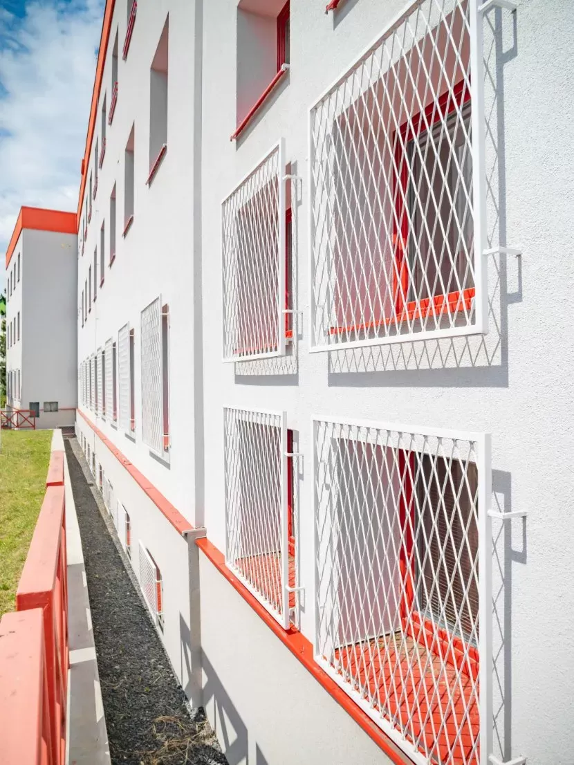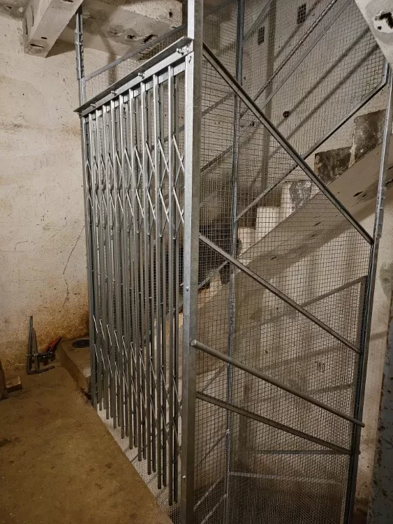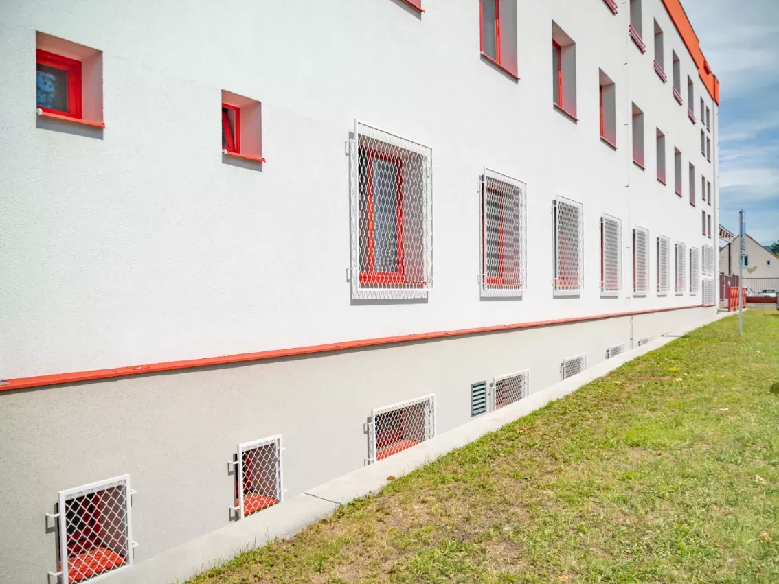 Anwendung: Schutzgitter für Feuerwache | Typ: Streckmetall 200 × 80 mm / Steg 6 mm + Streckmetall 100 × 65 mm / Steg 6 mm | Material: Stahl 4,0mm | Oberflächenbehandlung: Feuerverzinkung und Pulverbeschichtung