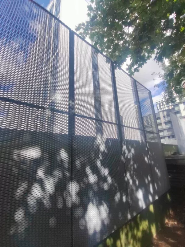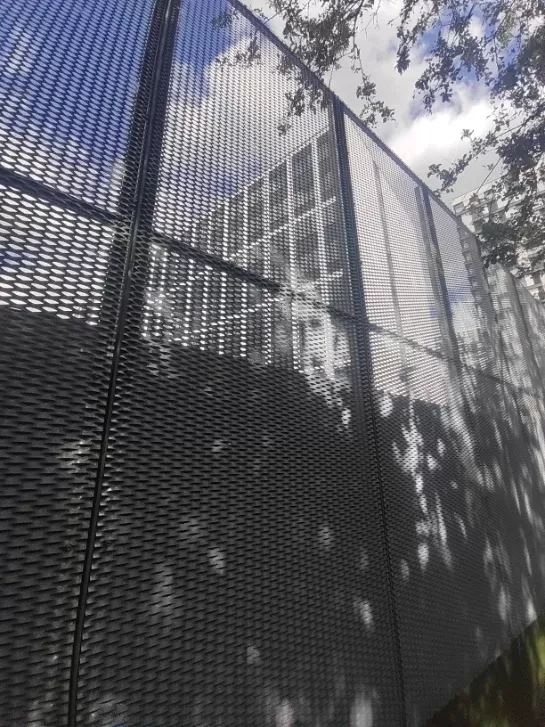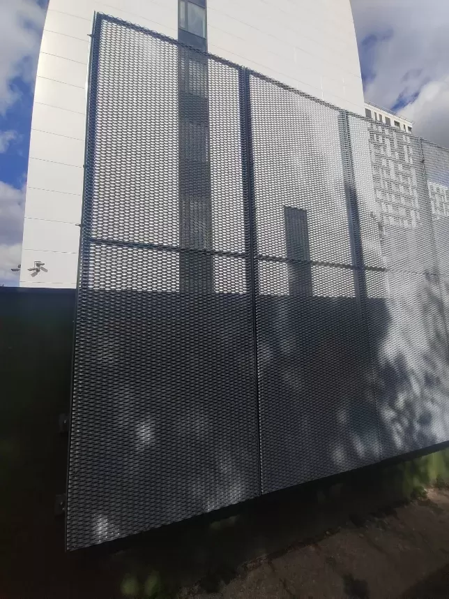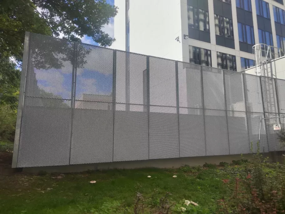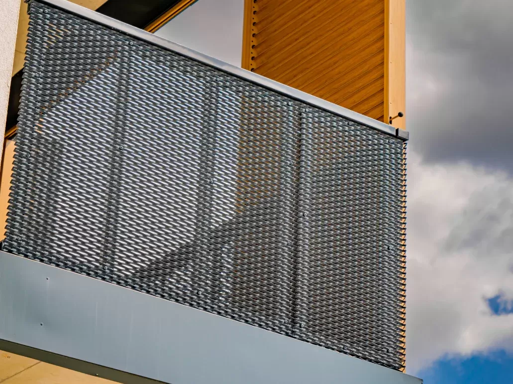 Anwendung: Balkonfüllungen | Typ: Streckmetall 62,5 × 25 mm / Steg 9 mm | Material: Aluminium 1,5mm | Oberflächenbehandlung: Fassaden-Pulverbeschichtung RAL 7016
