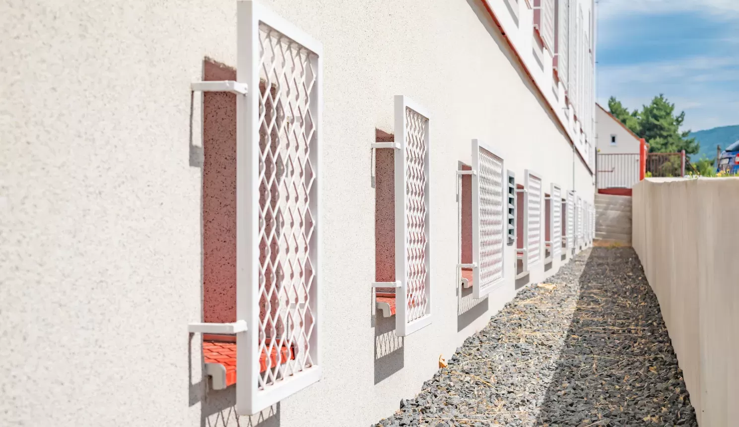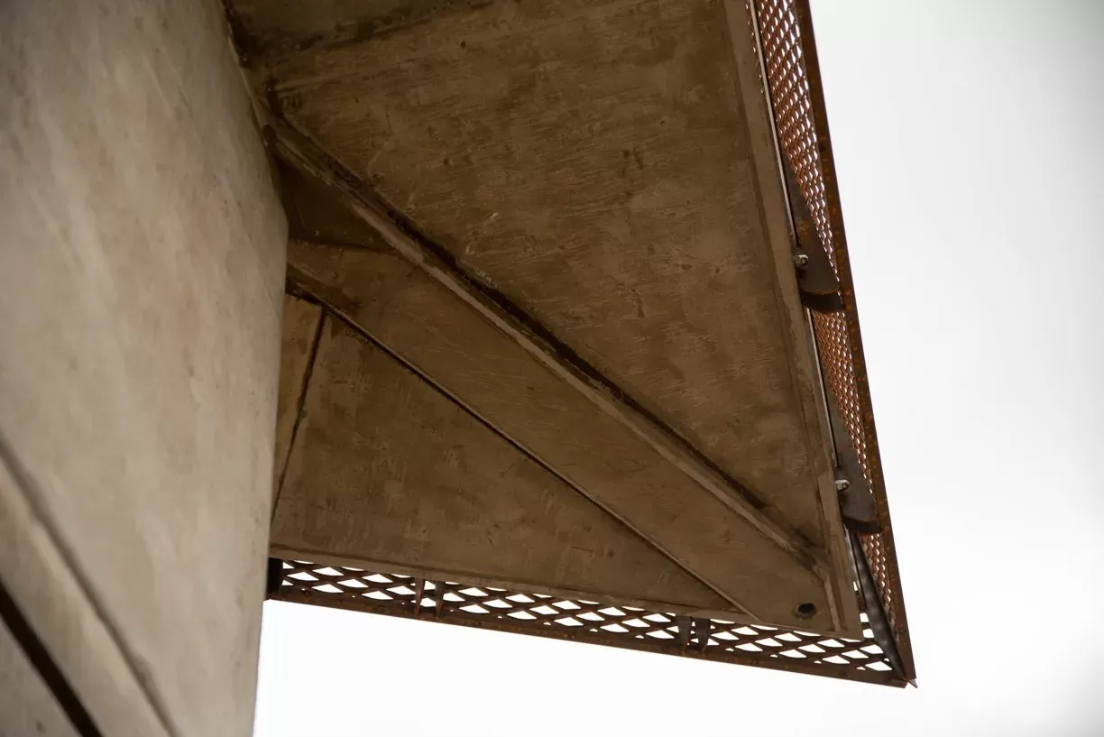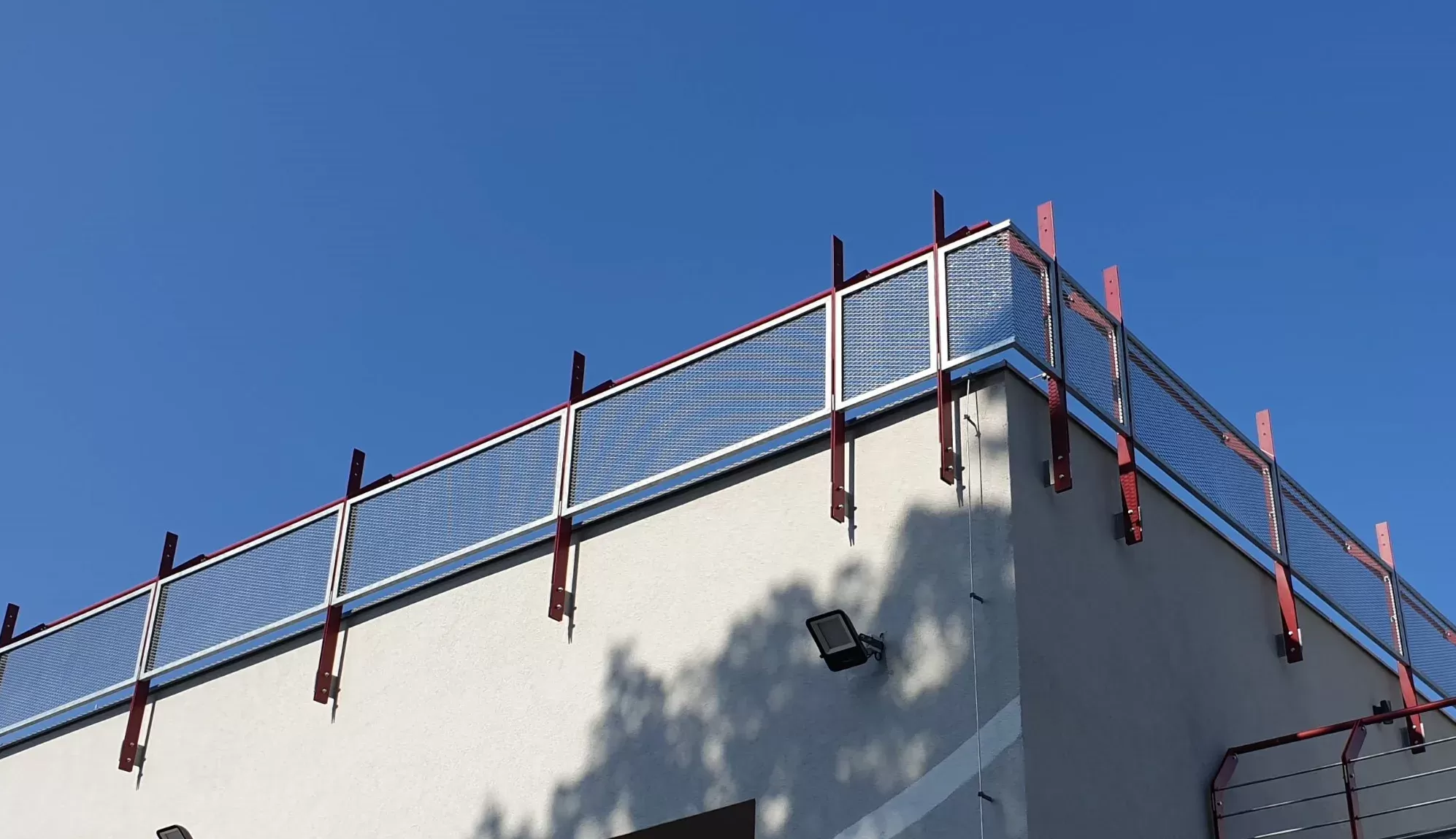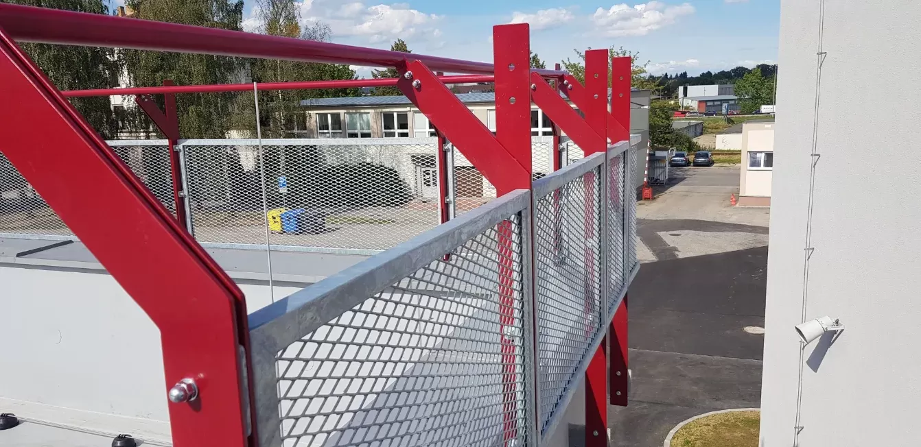 Anwendung: Geländer aus Streckmetall und Einfassprofil | Typ: Streckmetall 62,5 × 25 mm / Steg 3 mm + Einfassprofil WG40 | Material: Stahl 3,0 mm + Profil 2,0 mm | Oberflächenbehandlung: Feuerverzinkung + Pulverbeschichtung hellgrau