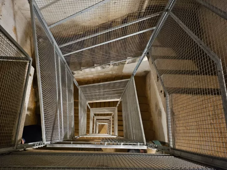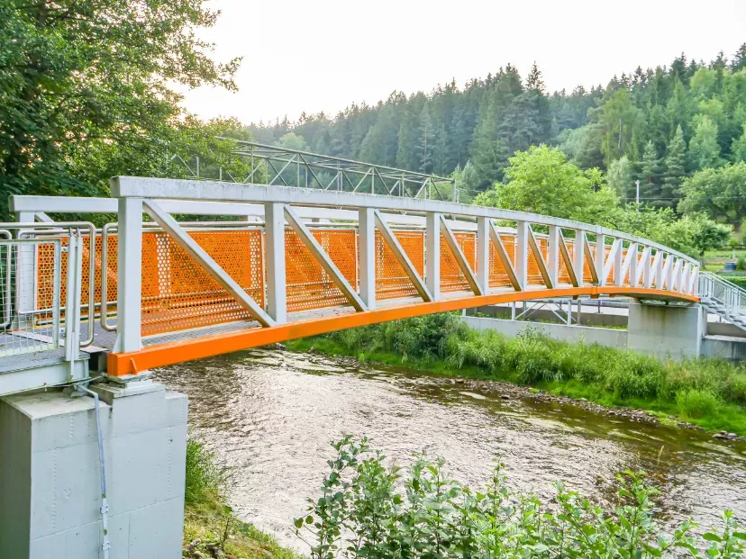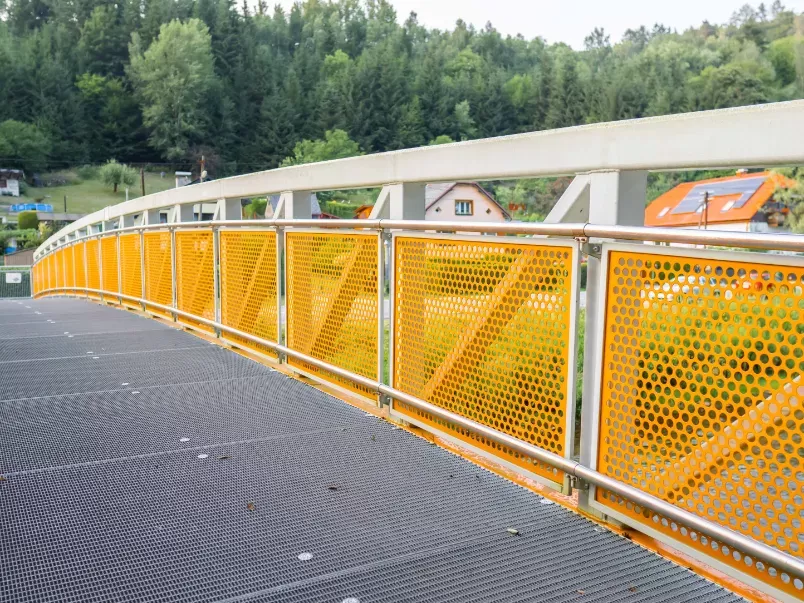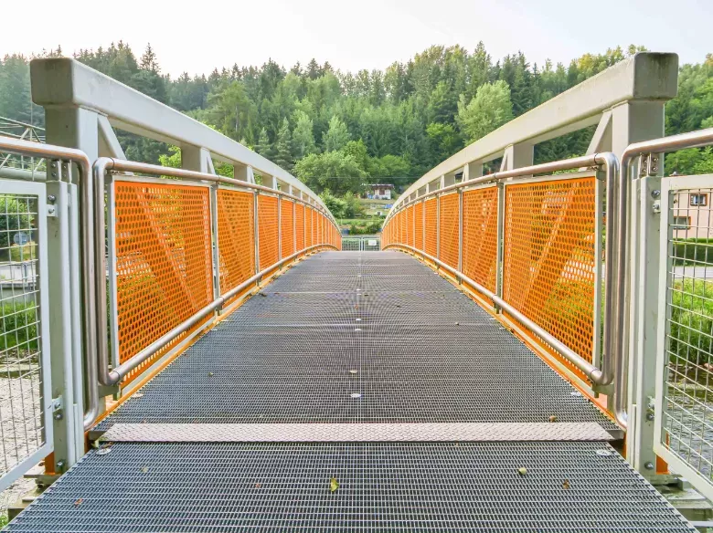 Anwendung: Steg aus Lochblech und geschweißtem Netz | Typ: Lochblech Rv 30-40 + geschweißtes Netz, Maschenweite 50 × 50 mm / Draht 3,0 mm | Material: Stahl 2,0 mm + Stahl / Draht 3,0 mm