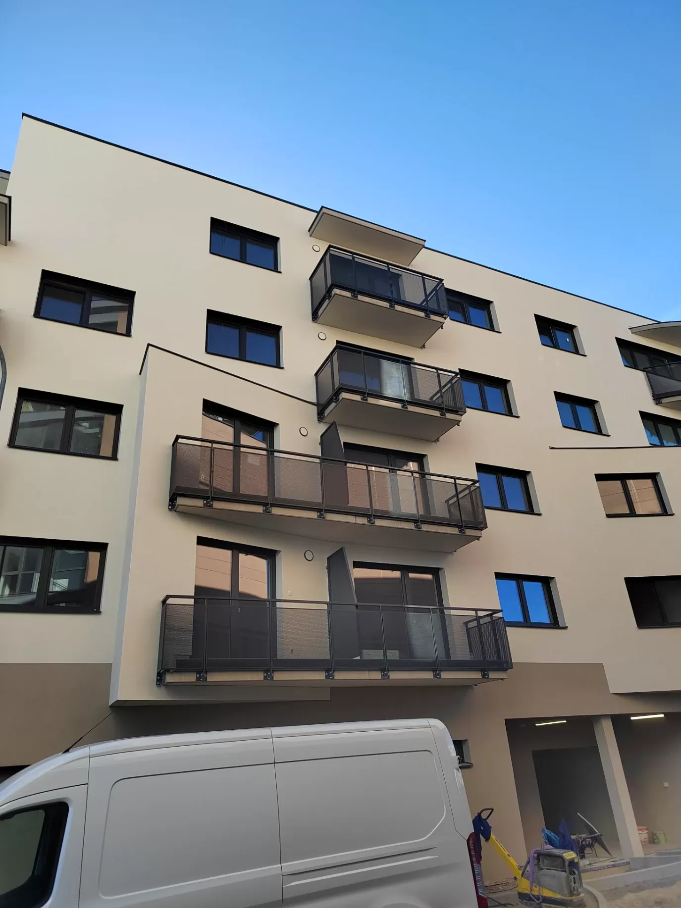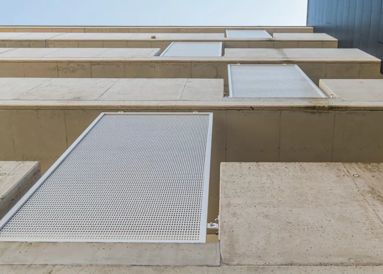 Anwendung: Balkonfüllungen | Typ: Lochblech Rv 10-15 | Material: Verzinktes Blech 1,5 mm | Oberflächenbehandlung: Pulverbeschichtung RAL 7016