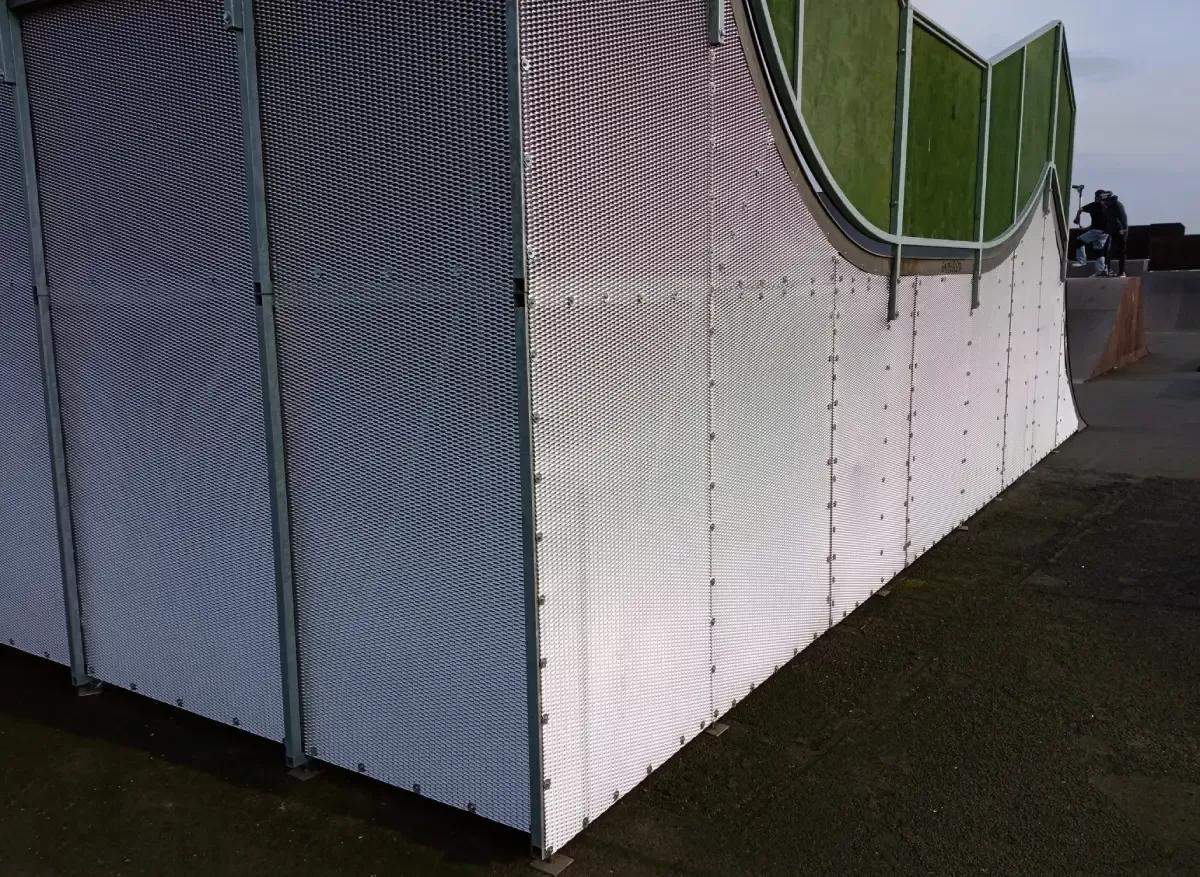 Anwendung: Elemente aus Streckmetall im Skatepark | Typ: Streckmetall 47 × 13 mm / Steg 5 mm | Material: Aluminium 2,0 mm