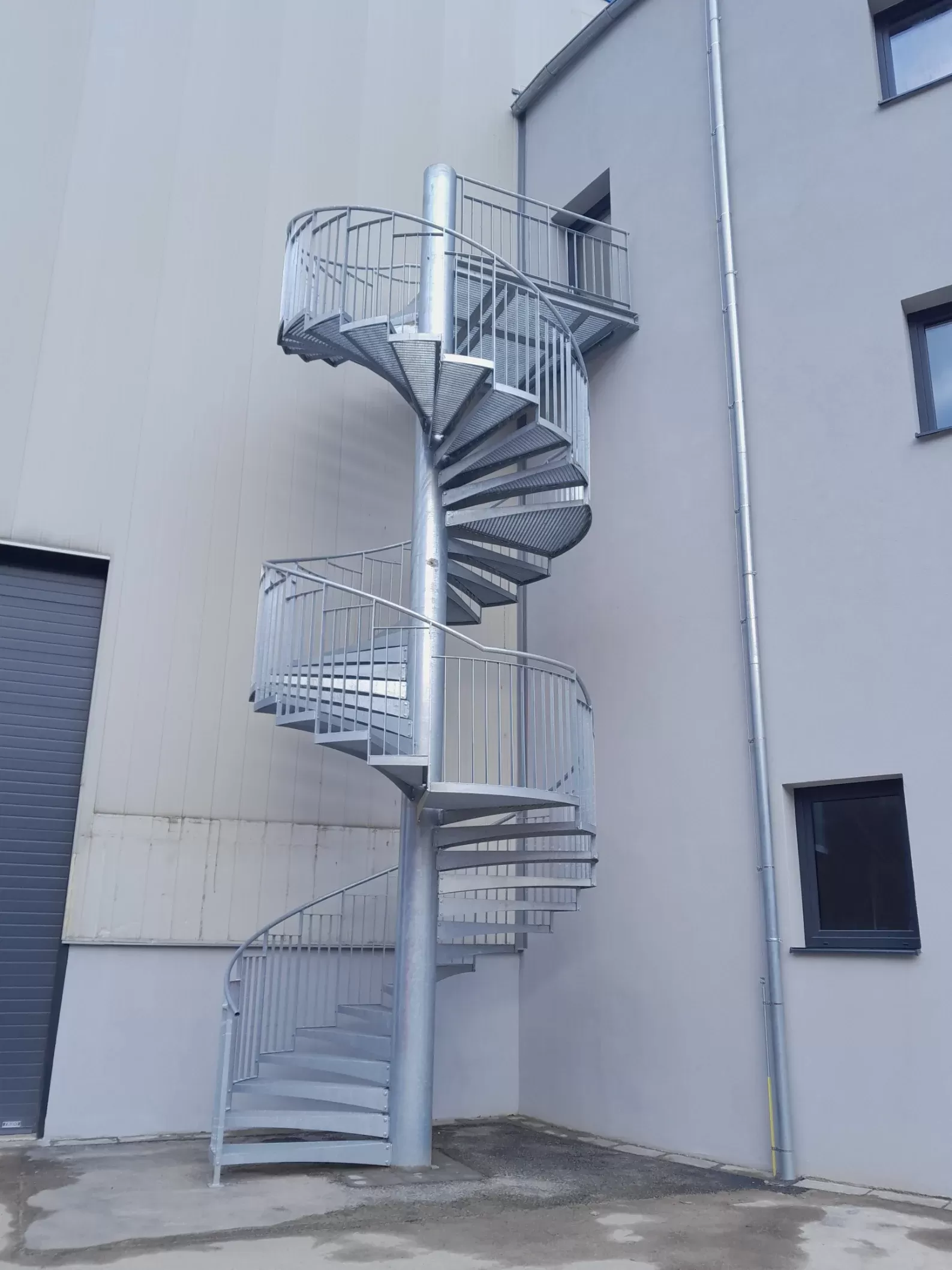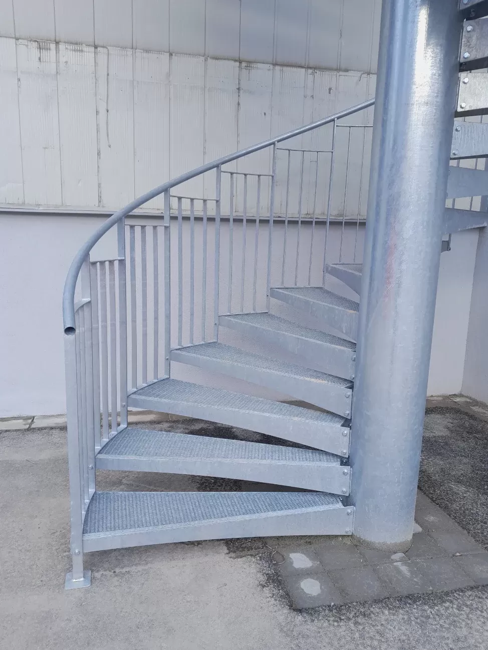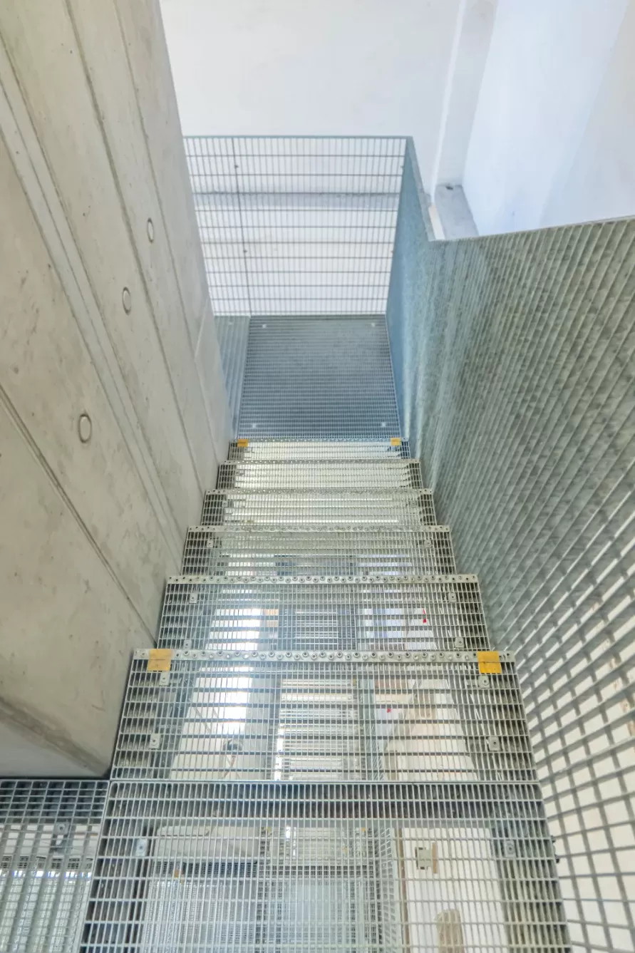 Anwendung: Wendeltreppe und Zwischengeschoss der Galerie | Typ: Gepresste Treppenstufe glatt 33 × 11 mm / Tragleiste 40 × 2 mm und gepresster Gitterrost glatt 33 × 33 mm / Tragleiste 30 × 2 mm | Material: Stahl | Oberflächenbehandlung: Feuerverzinkung