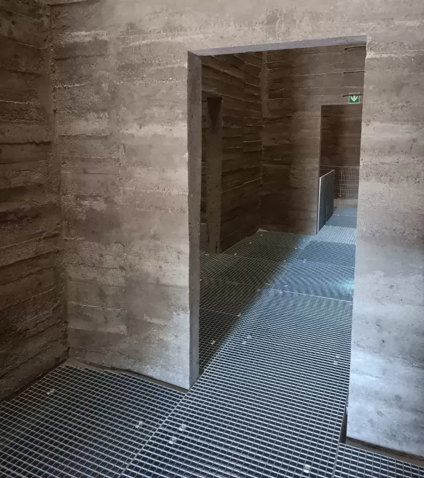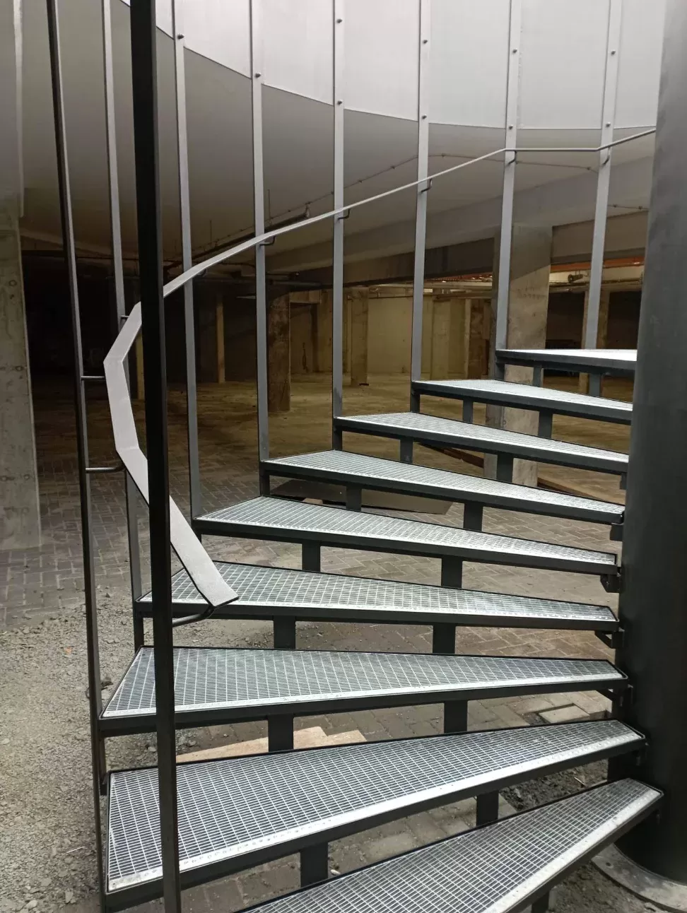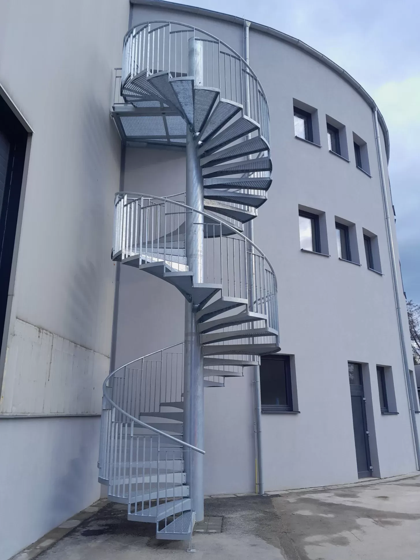 Anwendung: Wendeltreppe und Zwischengeschoss der Galerie | Typ: Gepresste Treppenstufe glatt 33 × 11 mm / Tragleiste 40 × 2 mm und gepresster Gitterrost glatt 33 × 33 mm / Tragleiste 30 × 2 mm | Material: Stahl | Oberflächenbehandlung: Feuerverzinkung