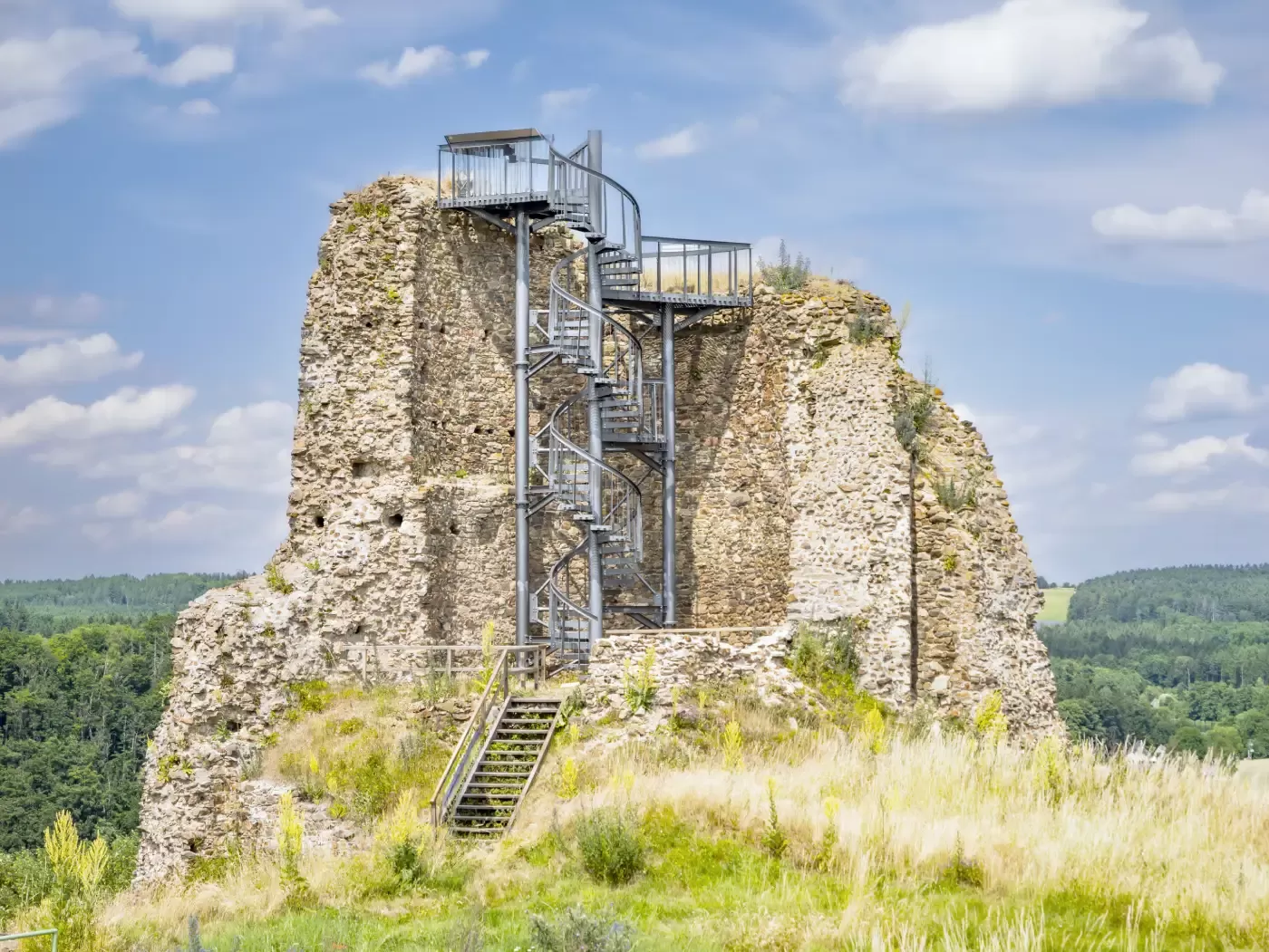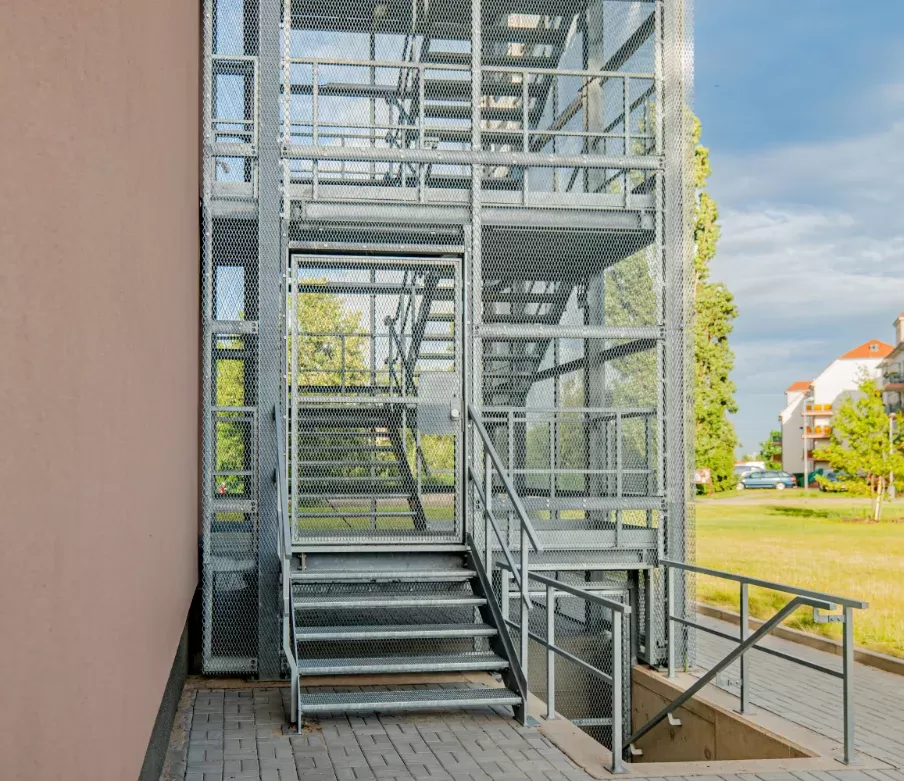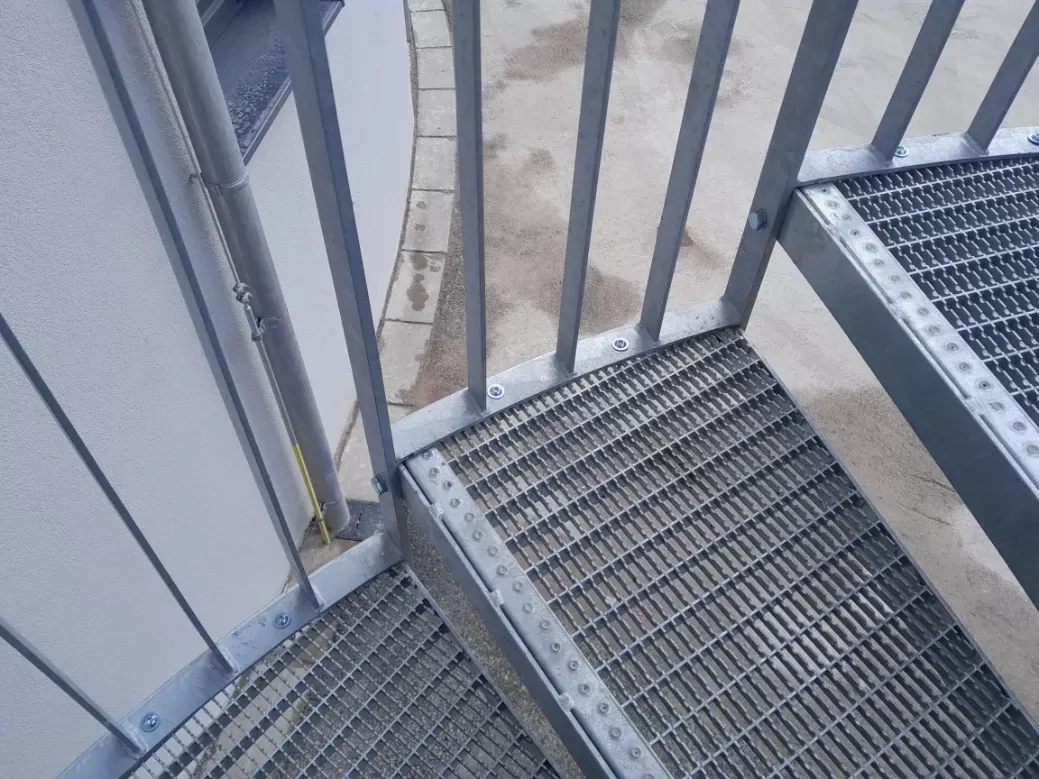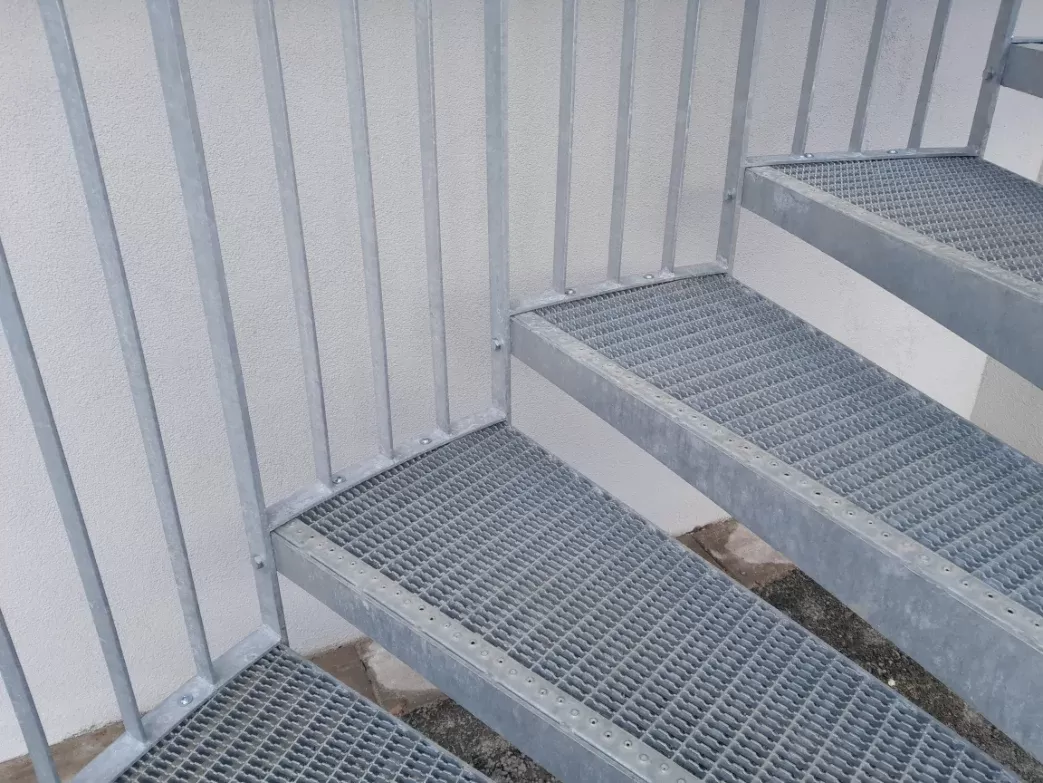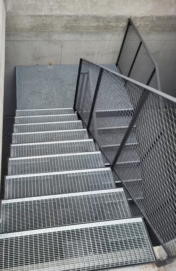 Anwendung: Treppe aus Gitterrosten und Geländer aus Streckmetall | Typ: Streckmetall, Rautenmasche TR 43 × 13 mm / Steg 3 mm | Material: Stahl | Oberflächenbehandlung: Feuerverzinkung