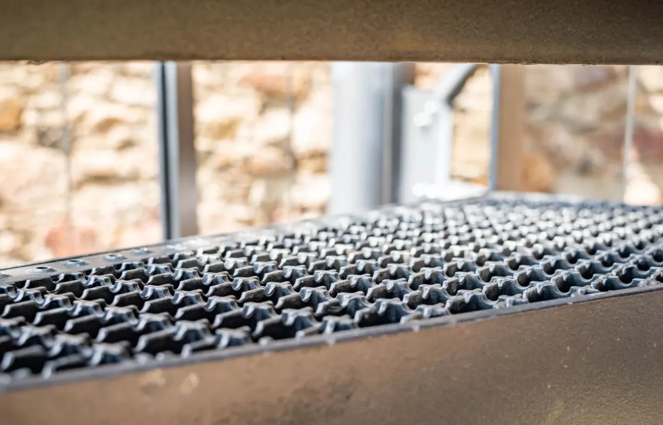 Anwendung: Gitterroste und Treppenverkleidungen | Typ: Gepresste Gitterroste und Stufen, Maschenweite 33 × 11 mm | Oberflächenbehandlung: Feuerverzinkung